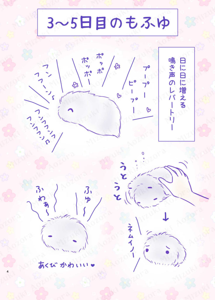「今のもう一回鳴いてみて」「ごめんね、いやだったね」「もふちゃん、もふちゃん」「いいこだね~」などなど。